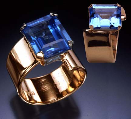 14k Ring w/french-emerald cut Swiss Blue Topaz aprx. 6.75 cts. up to size 9. (French cut not shown).Can be custom ordered w/ other gemstones to your size. Call/'E" for price quote.